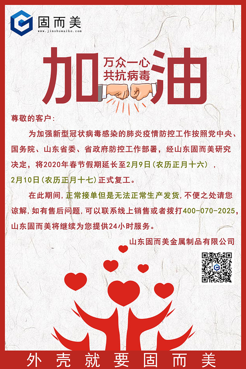 為加強(qiáng)新型冠狀病毒感染的肺炎疫情防控工作按照黨中央、國務(wù)院、山東省委、省政府防控工作部署,經(jīng)山東固而美研究決定,將2020年春節(jié)假期延長至2月9日(農(nóng)歷正月十六) , 2月10日(農(nóng)歷正月十七)正式復(fù)工。