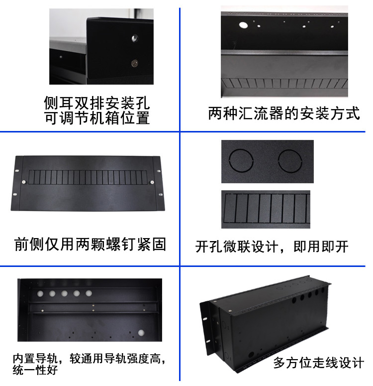 1、走線方式:支持上走線、下走線、左、右側方走線。且開置多個線束固定扎帶孔,走線更牢固,美觀。